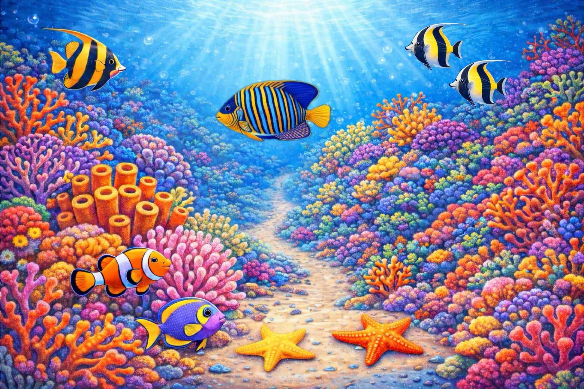 Bright coral gardens frame a sandy underwater pathway where tropical fish glide through clear blue light.